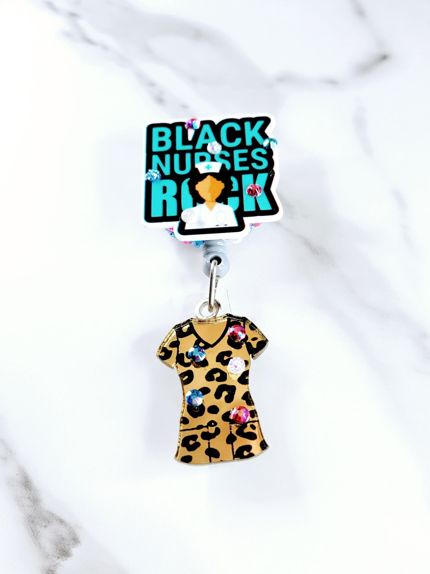 "Black Nurses Rock" - teal with cheetah print gold mirror scrub top