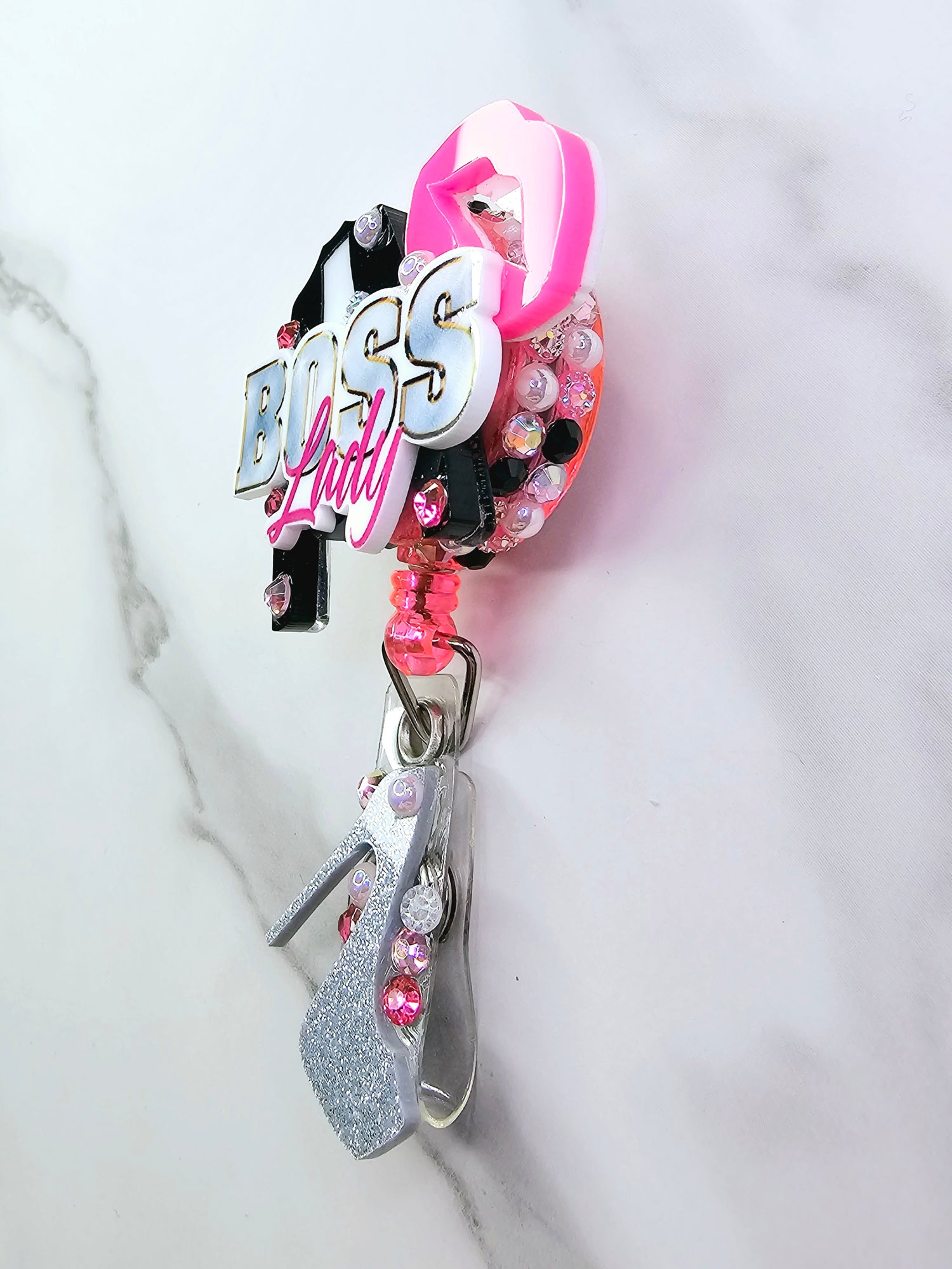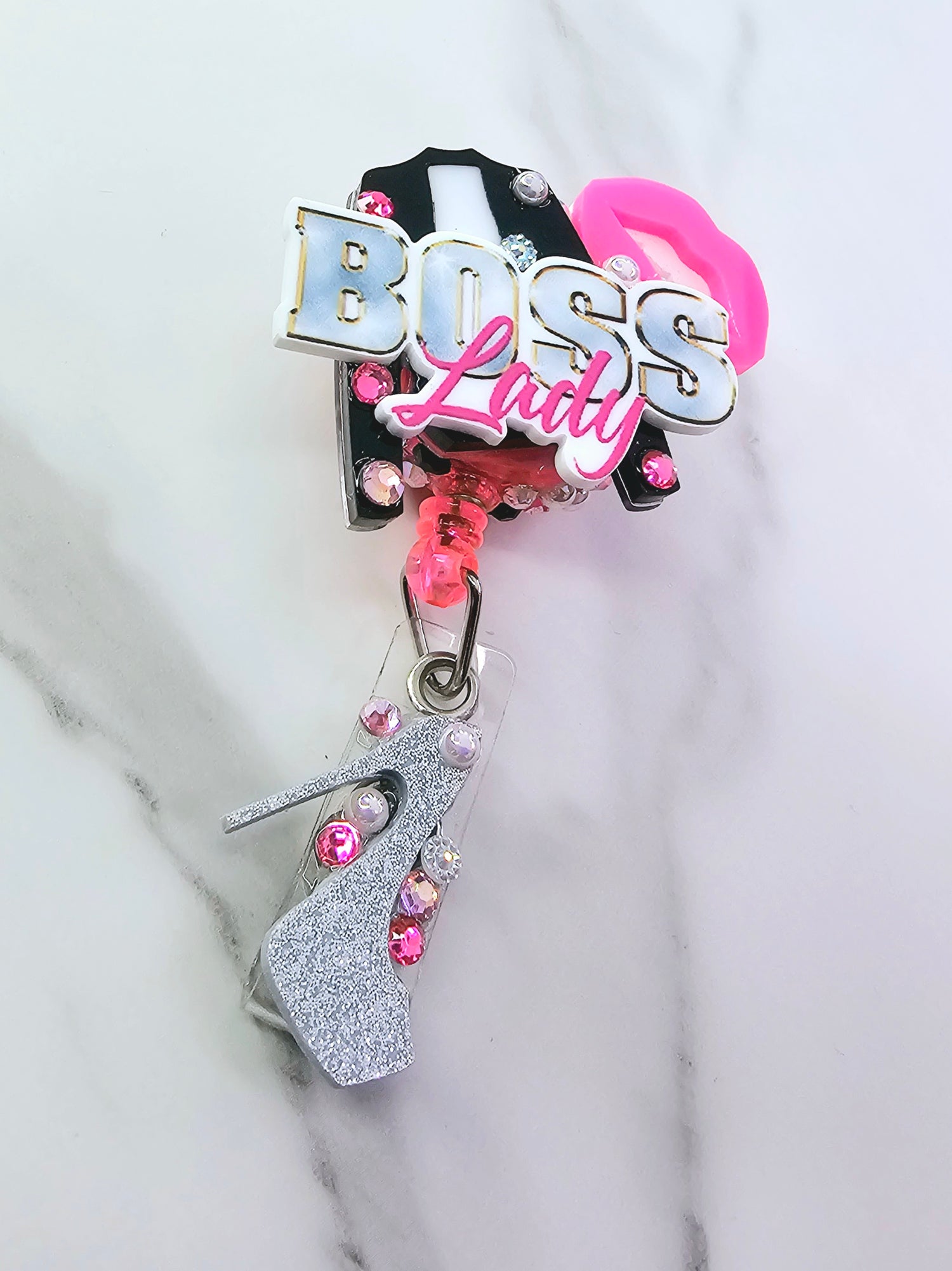 "Boss Lady" layered on acrylic blazer & hot pink lips w/heel