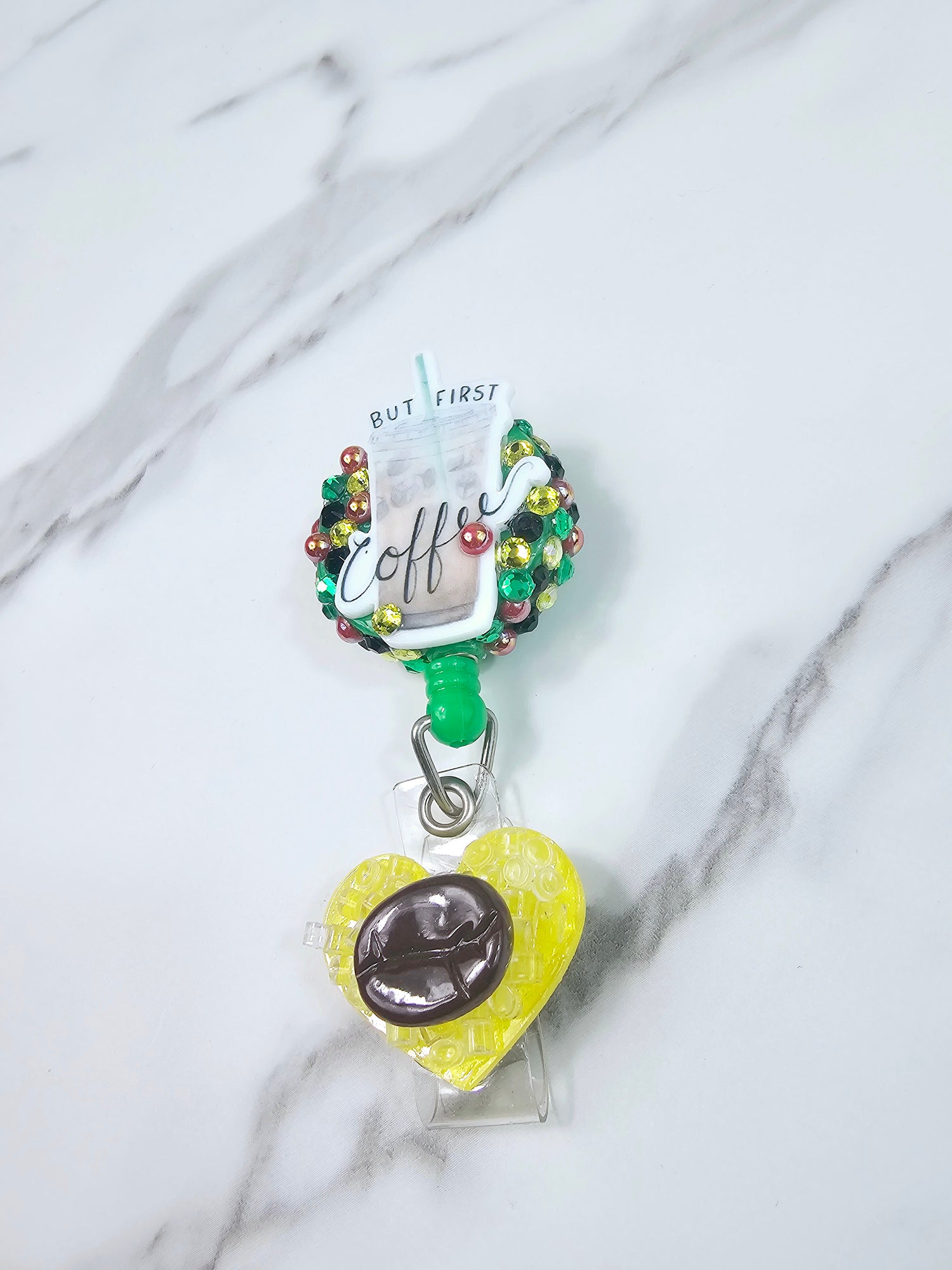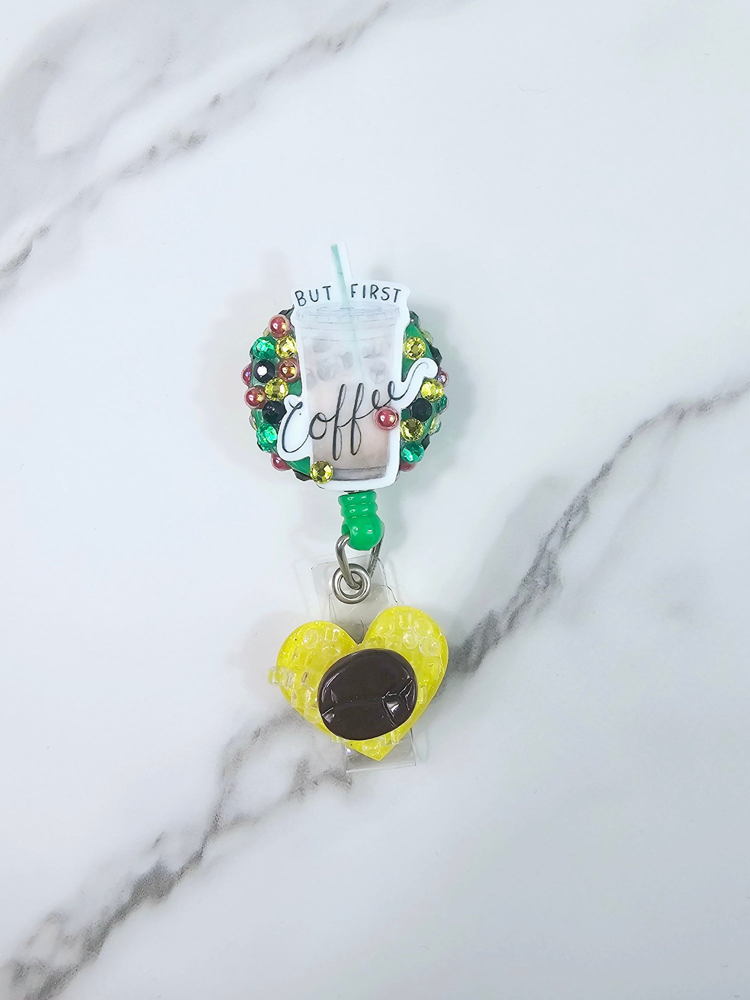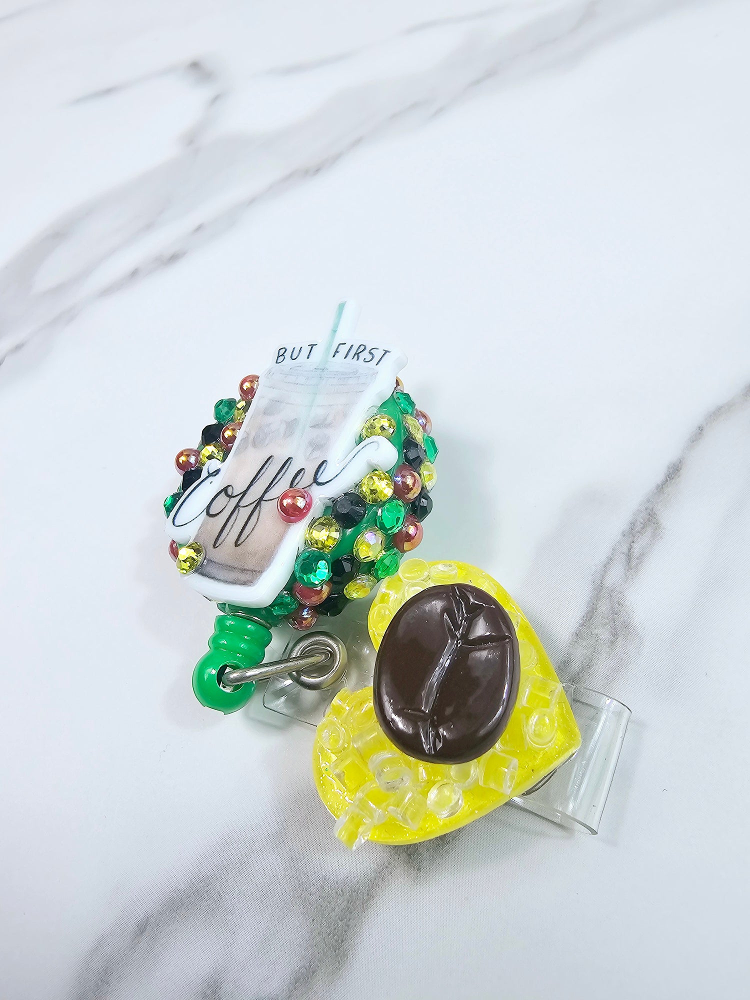 Iced coffee cup "But first coffee" with a yellow heart, mini ice cubes and a coffee bean on the tail