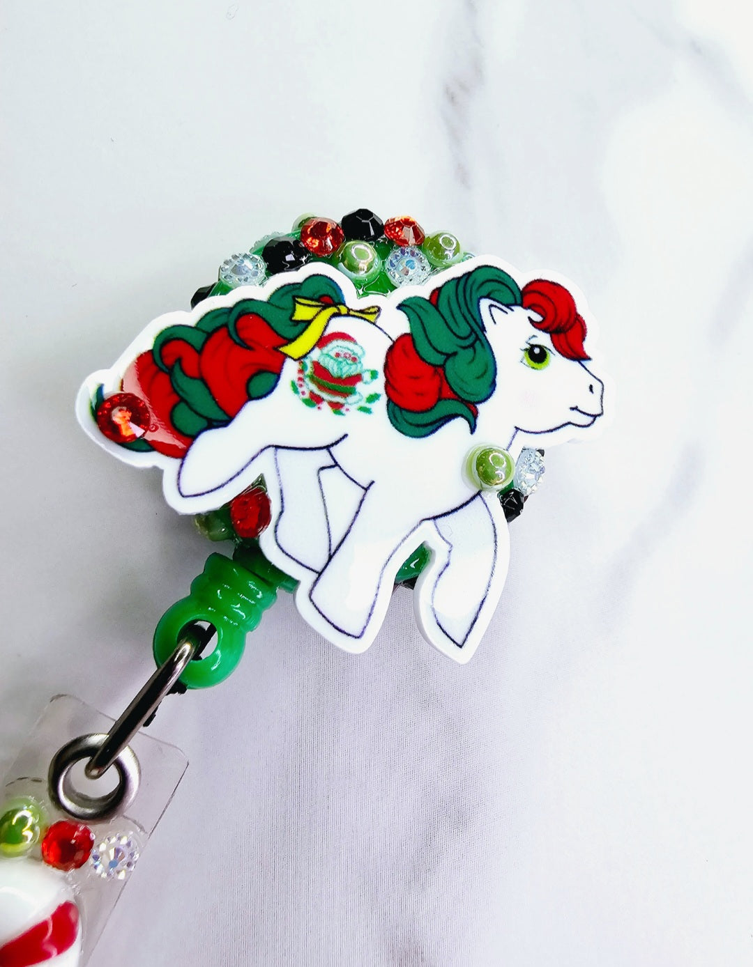 Holiday Pony with Santa design on hip.