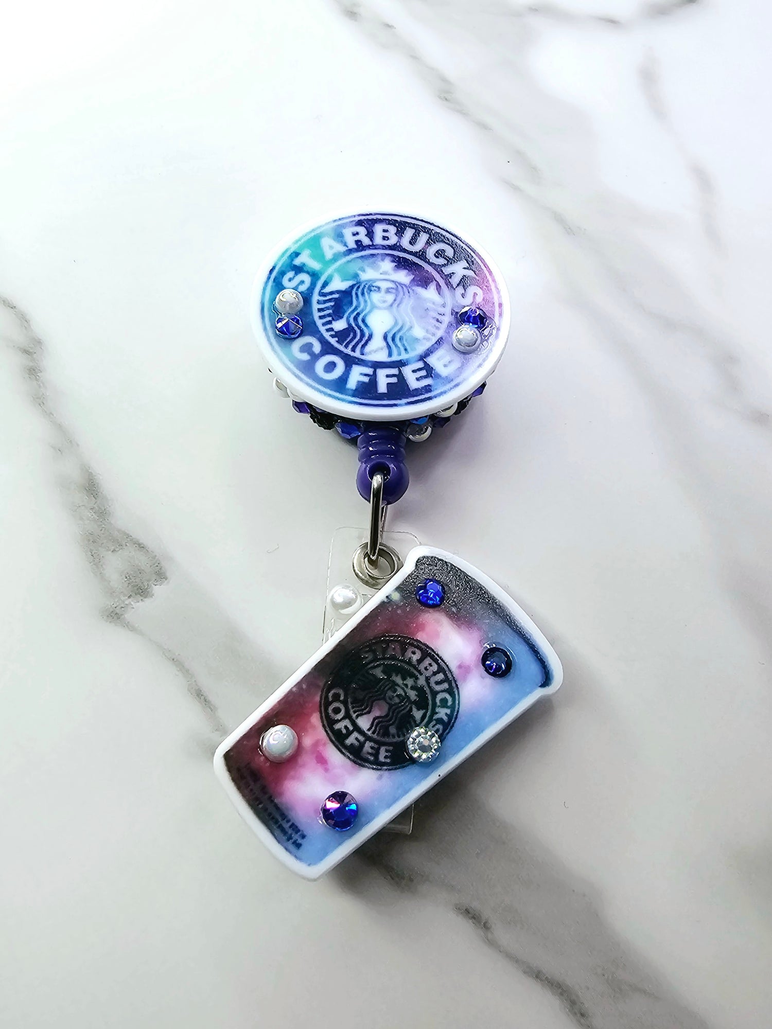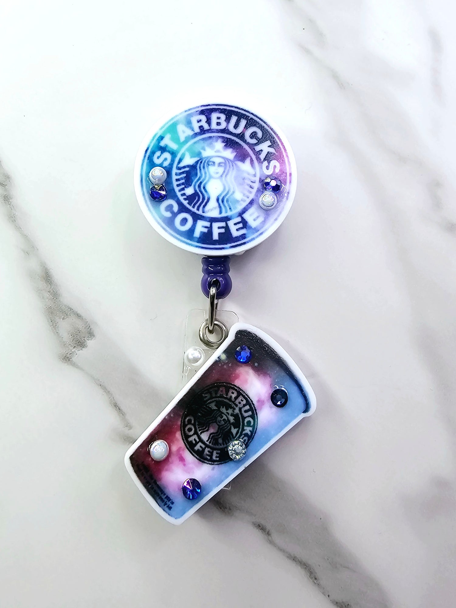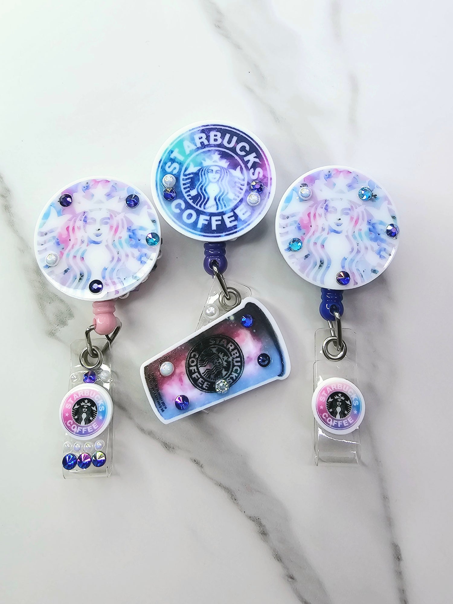•Galaxy SB logo on pink badge w/mini logo & rhinestones • Dark Galaxy logo on purple badge w/large cup • Galaxy SB logo on blue badge w/mini logo