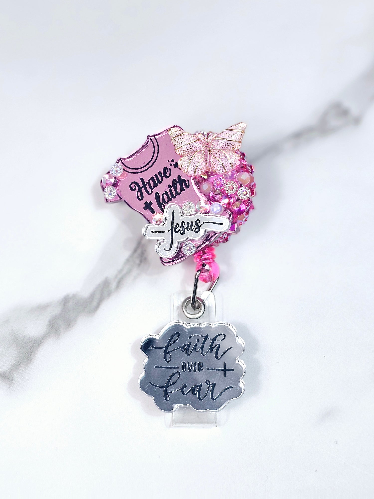 "Have Faith" Pink mirror shirt with silver mirror "Faith over Fear" on tail