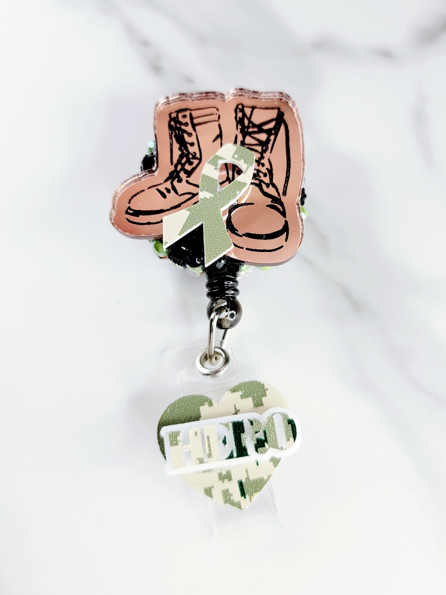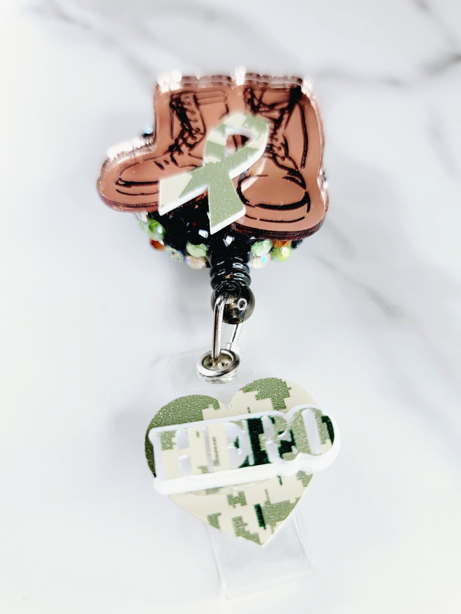 Light brown mirrored combat boot with digital army camo ribbon. Tail has a digital army camo heart with matching "hero" with a white border