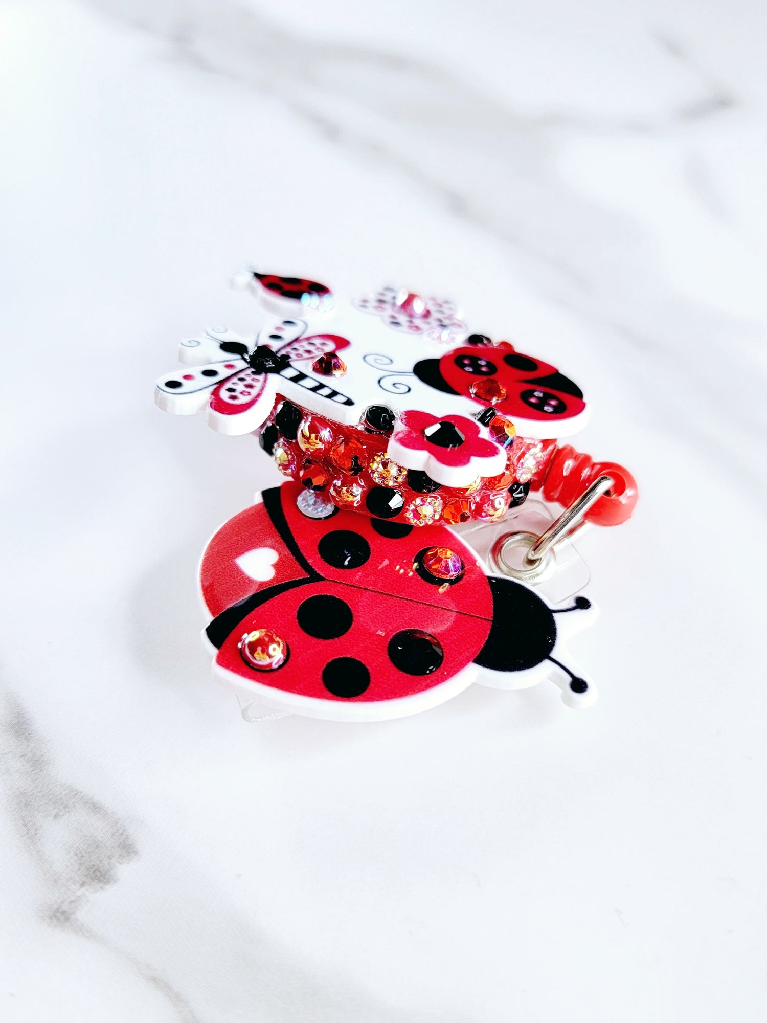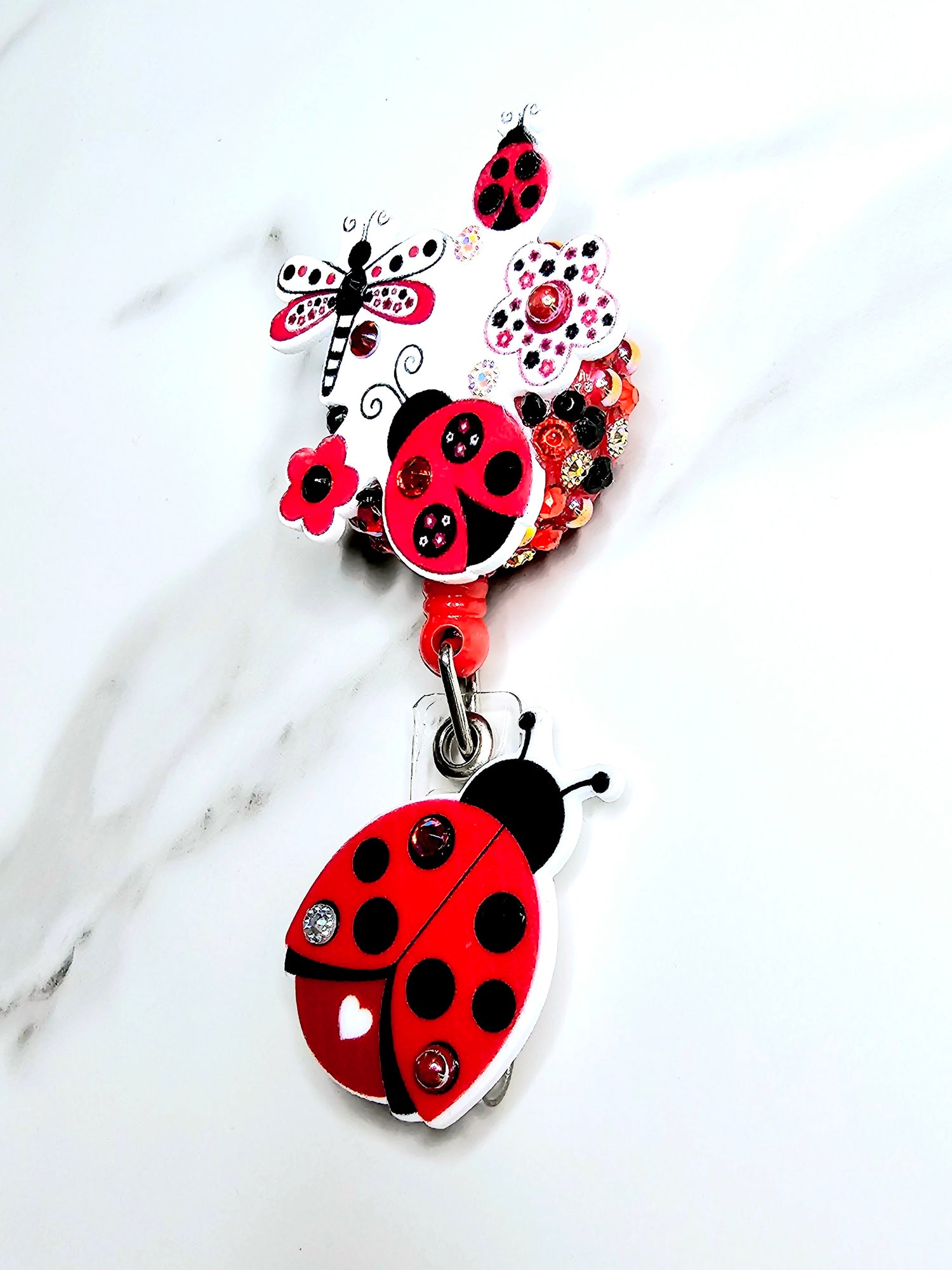 Red ladybugs with flowers and a dragonfly