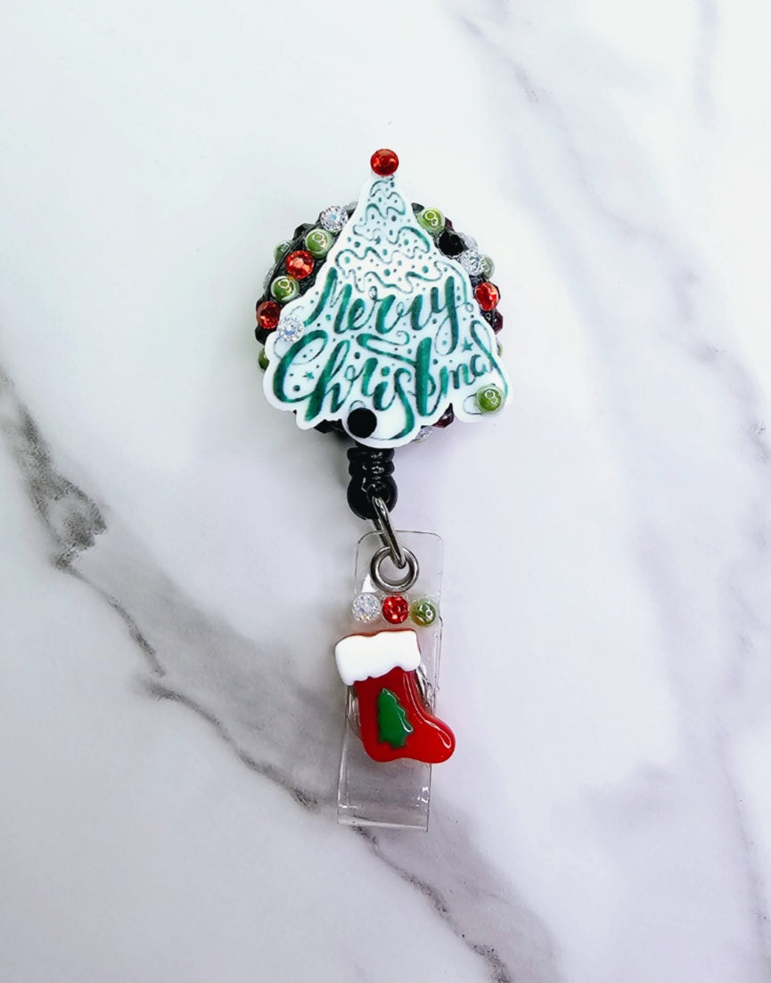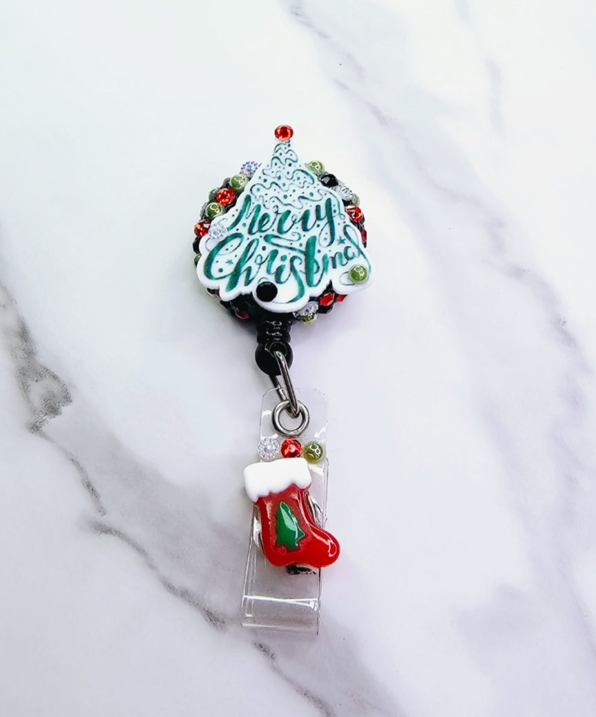 "Merry Christmas" tree with stocking.
