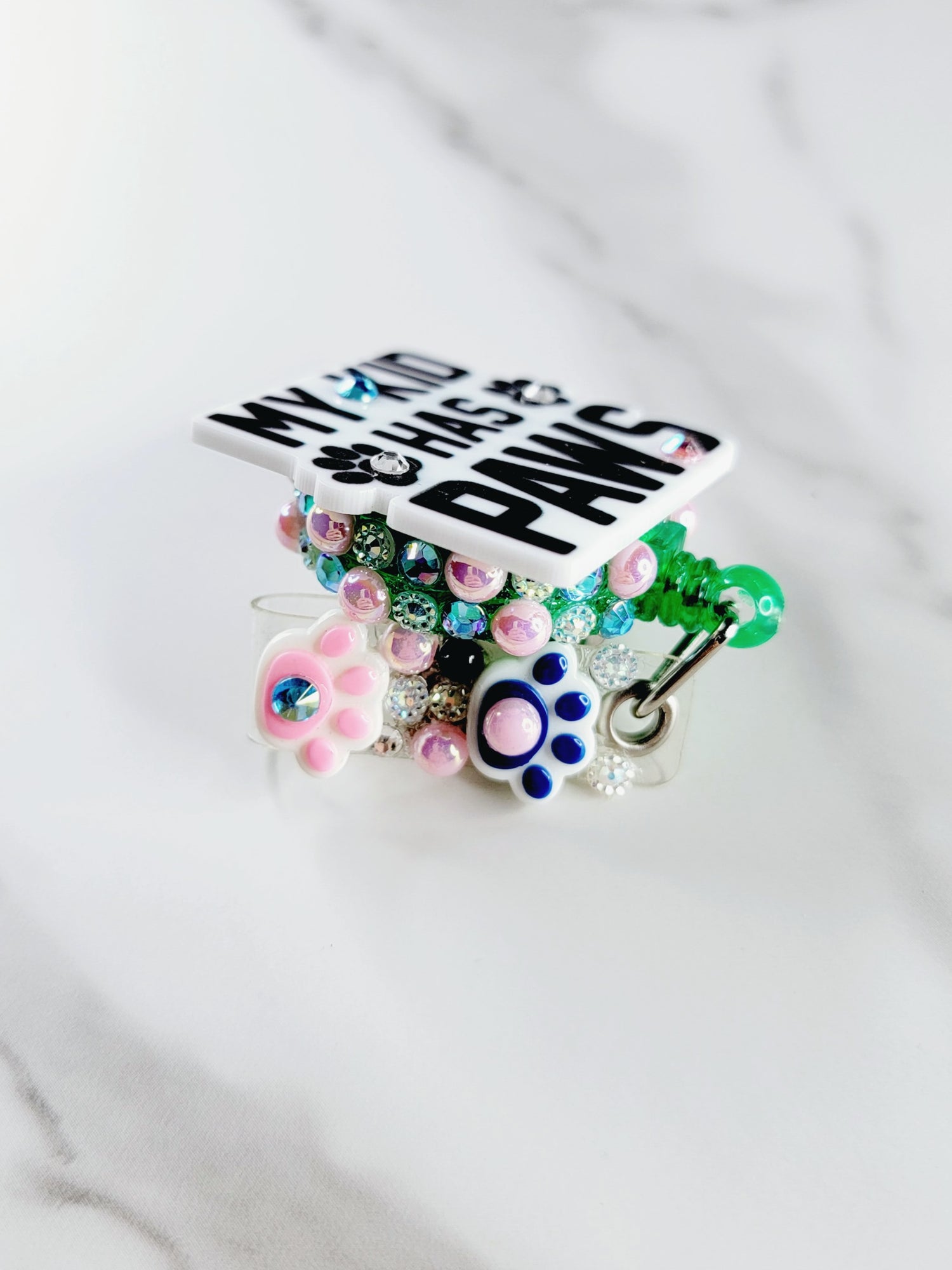 "My kid has paws" with pink and blue paw prints on the tail