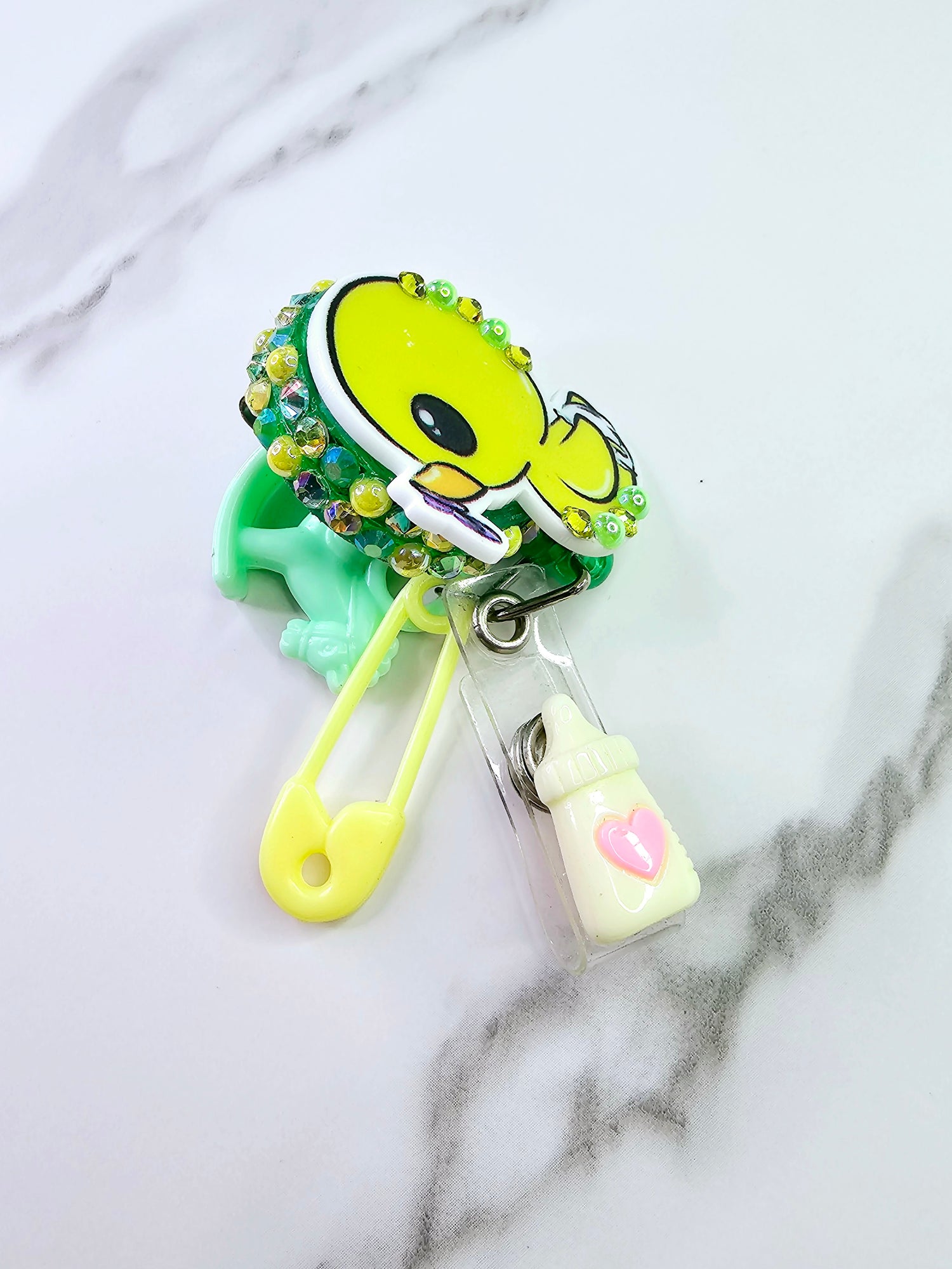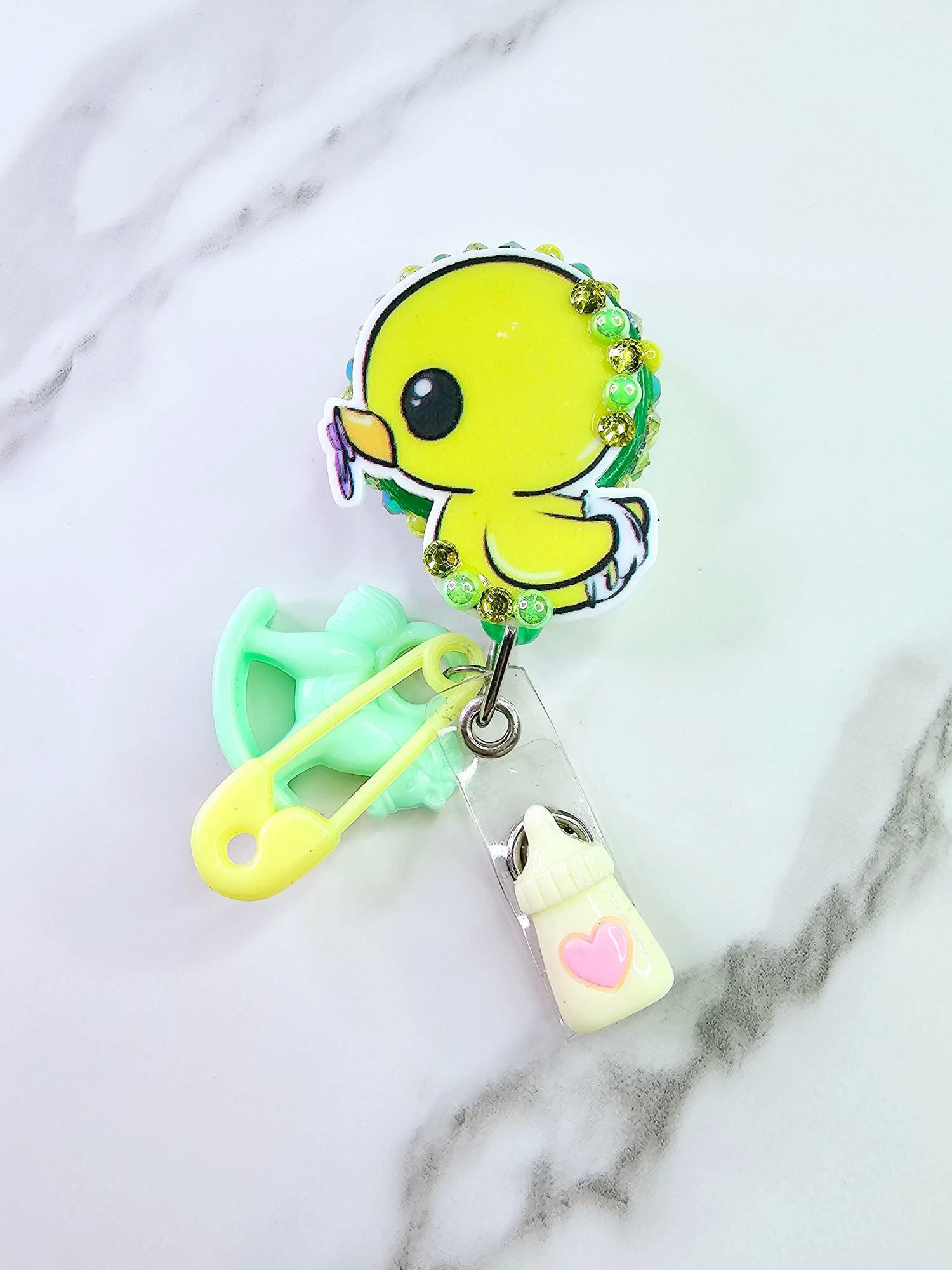 •Yellow baby duck wearing a diaper & pacifier. Baby bottle on tail with 2 plastic charms attached (rocking horse & pin)