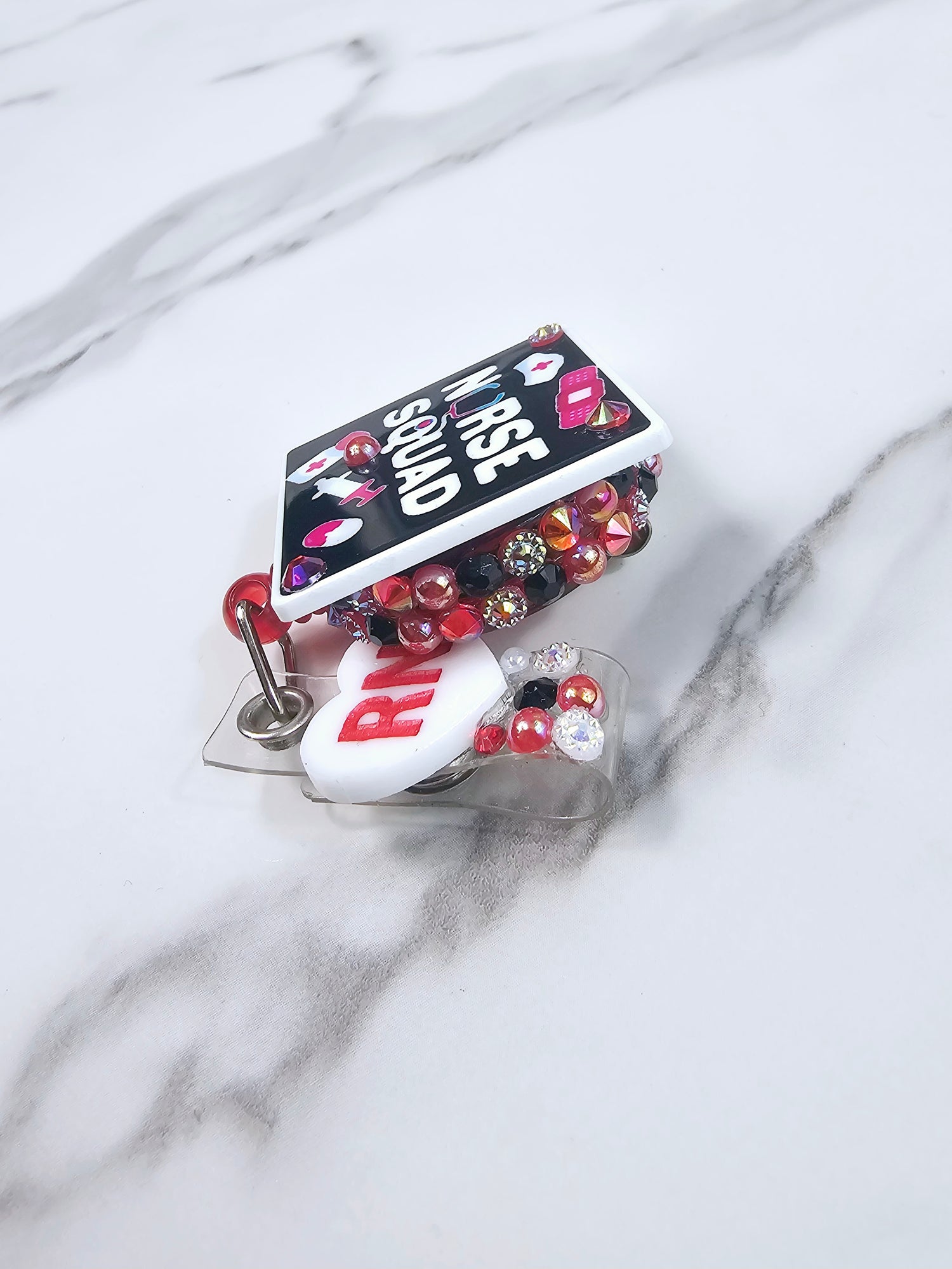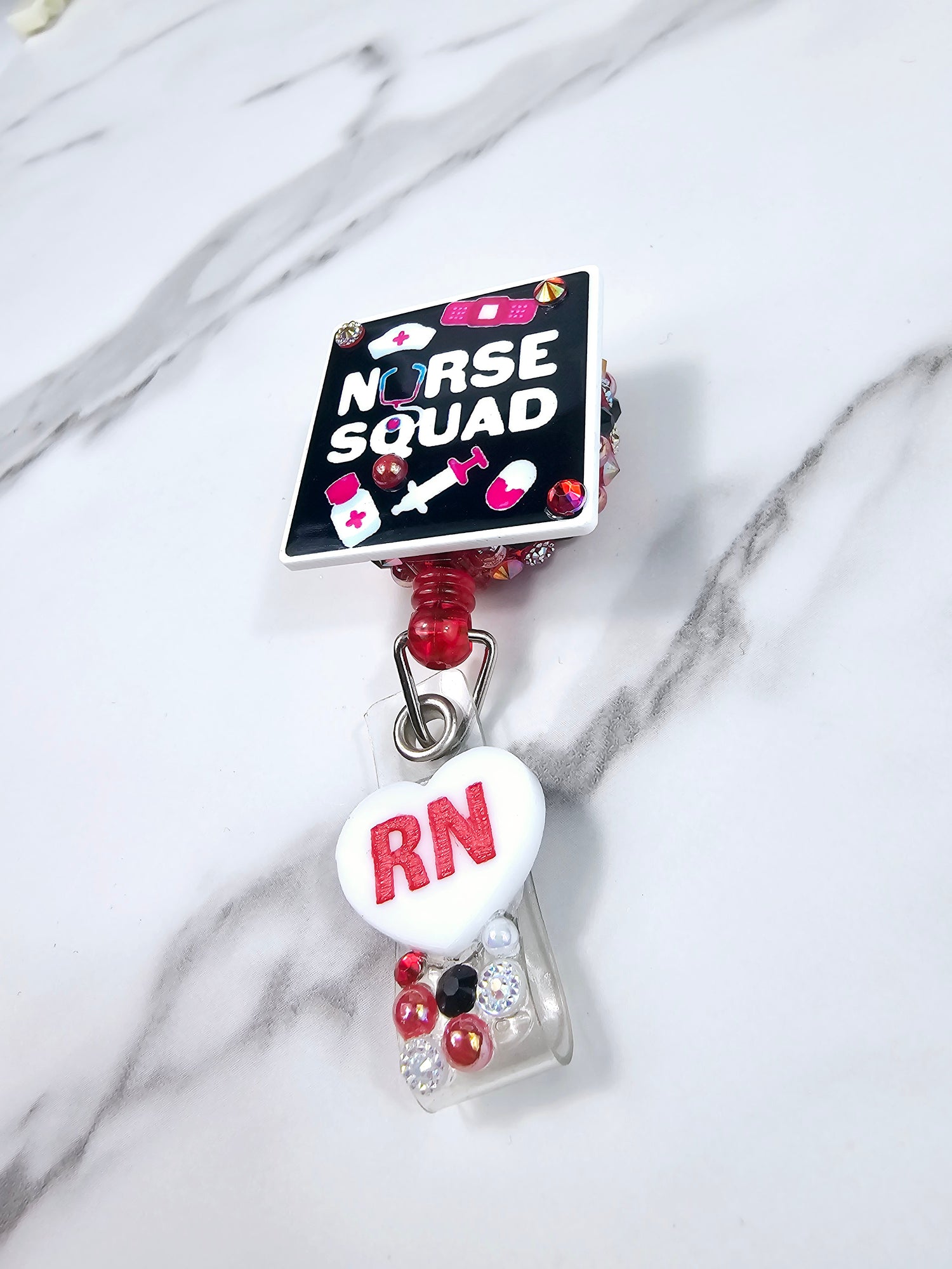 "Nurse Squad" healthcare background with white heart engraved with red RN on the tail.