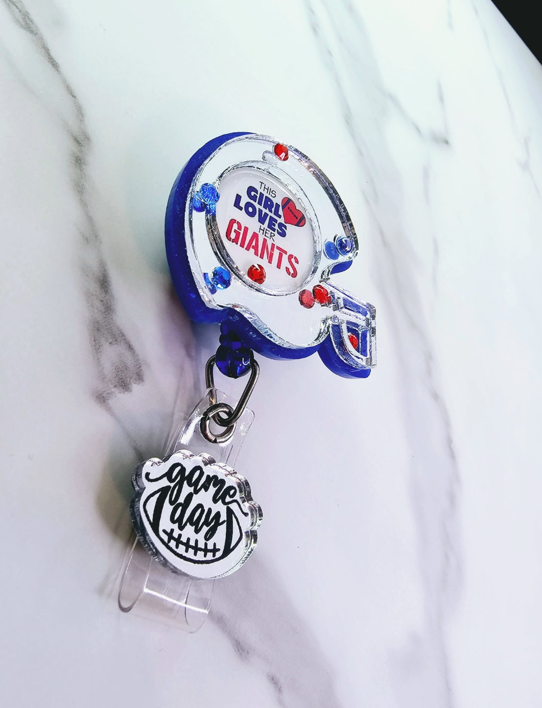 "This girl loves the Giants" inside a mirrored acrylic helmet with a mirrored "game day" acrylic football on the tail
