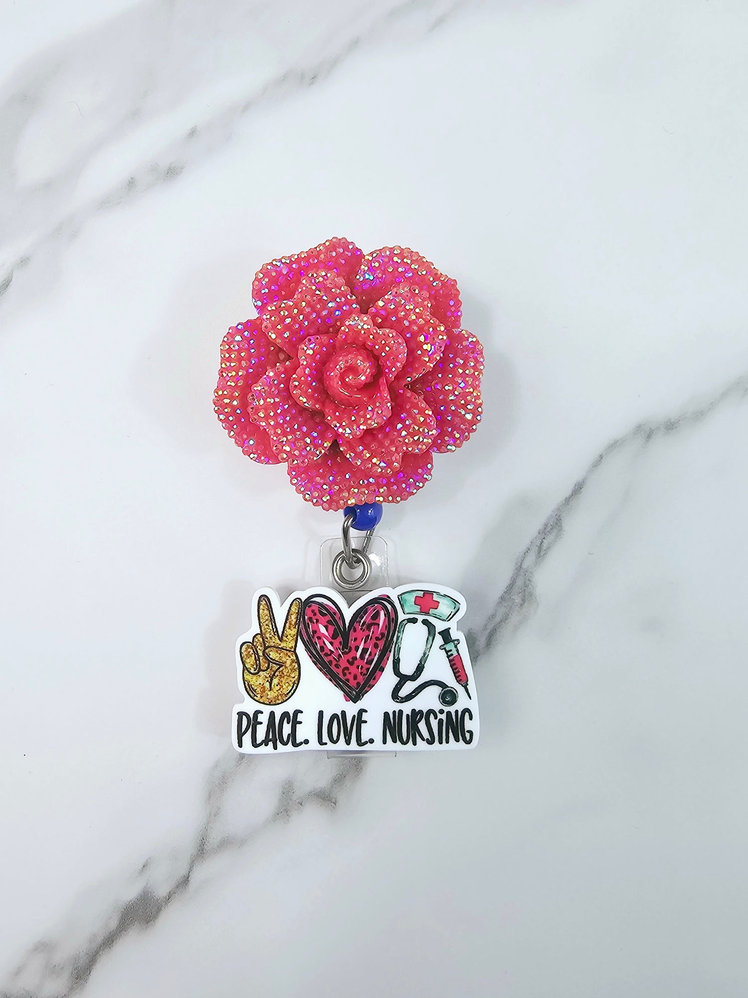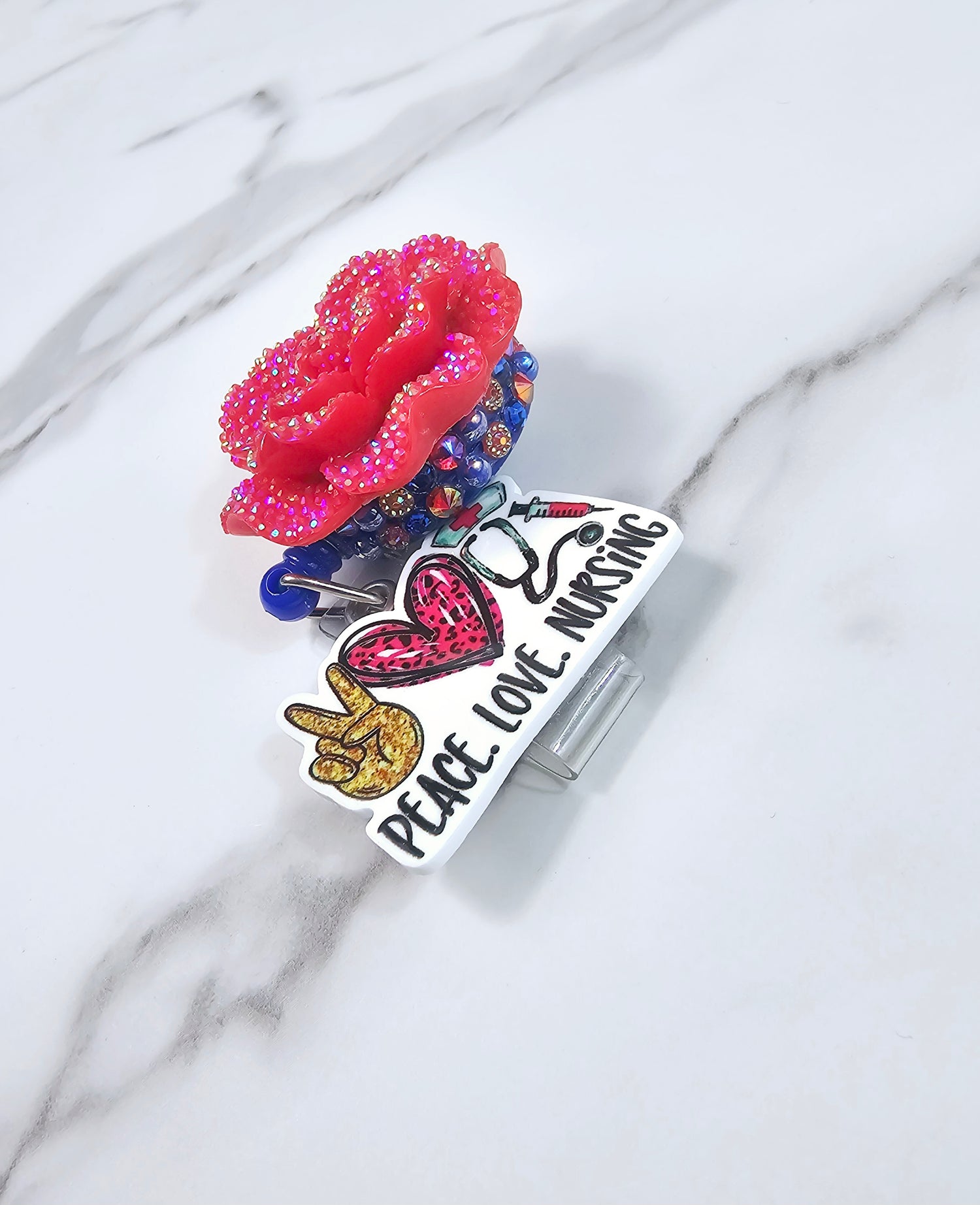 Red bling flower with "Peace love nursing" on the tail