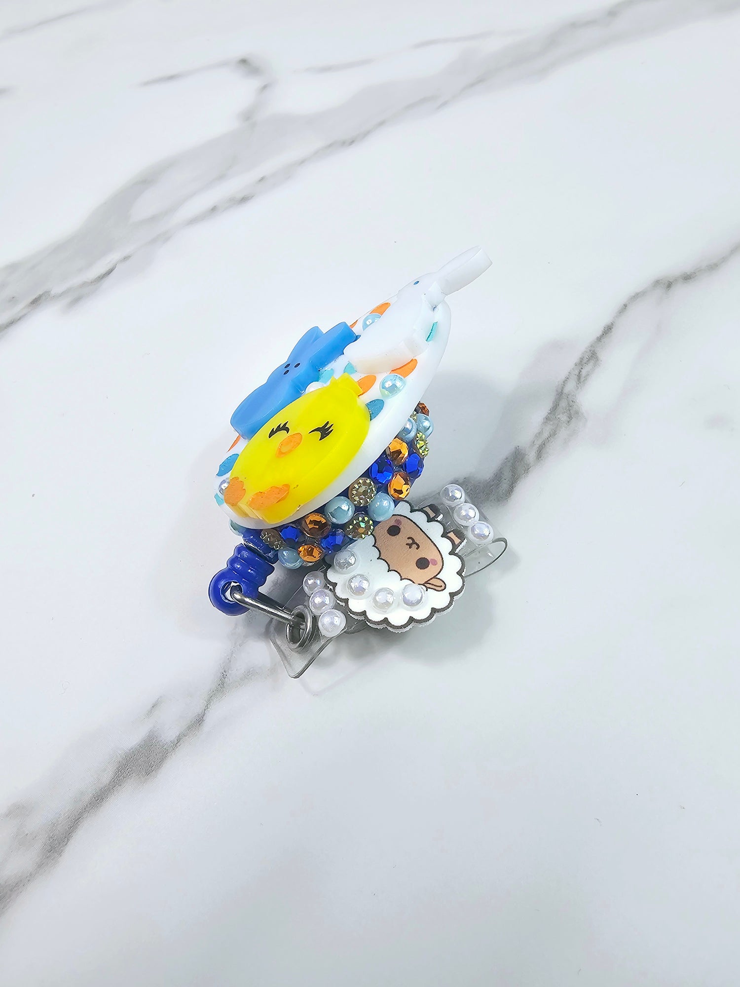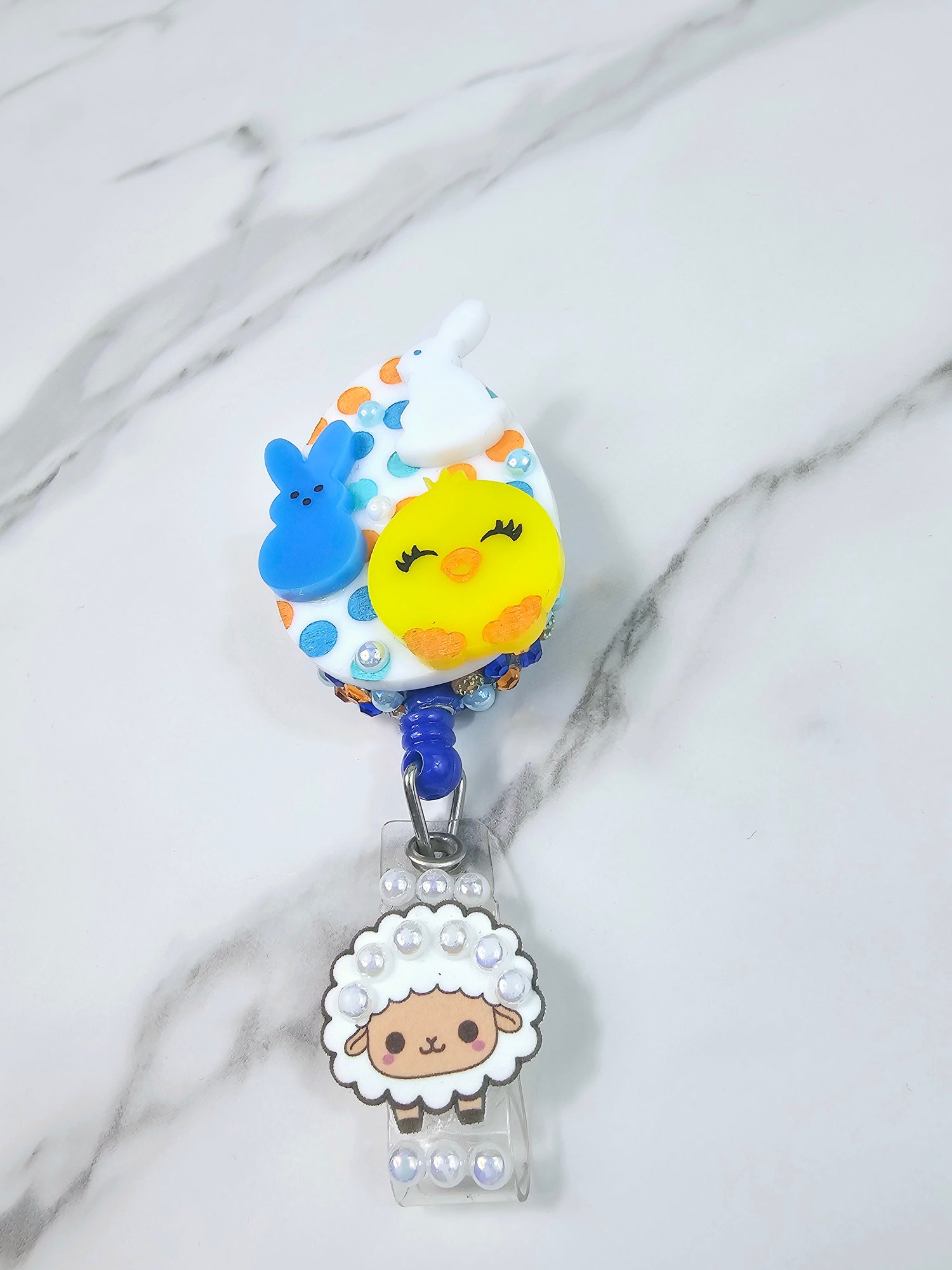 Blue peep bunny, white bunny and a chick on an orange & blue polkadot egg with a sheep on the tail
