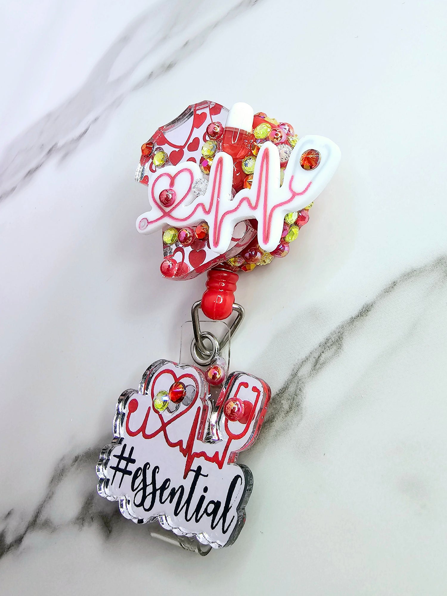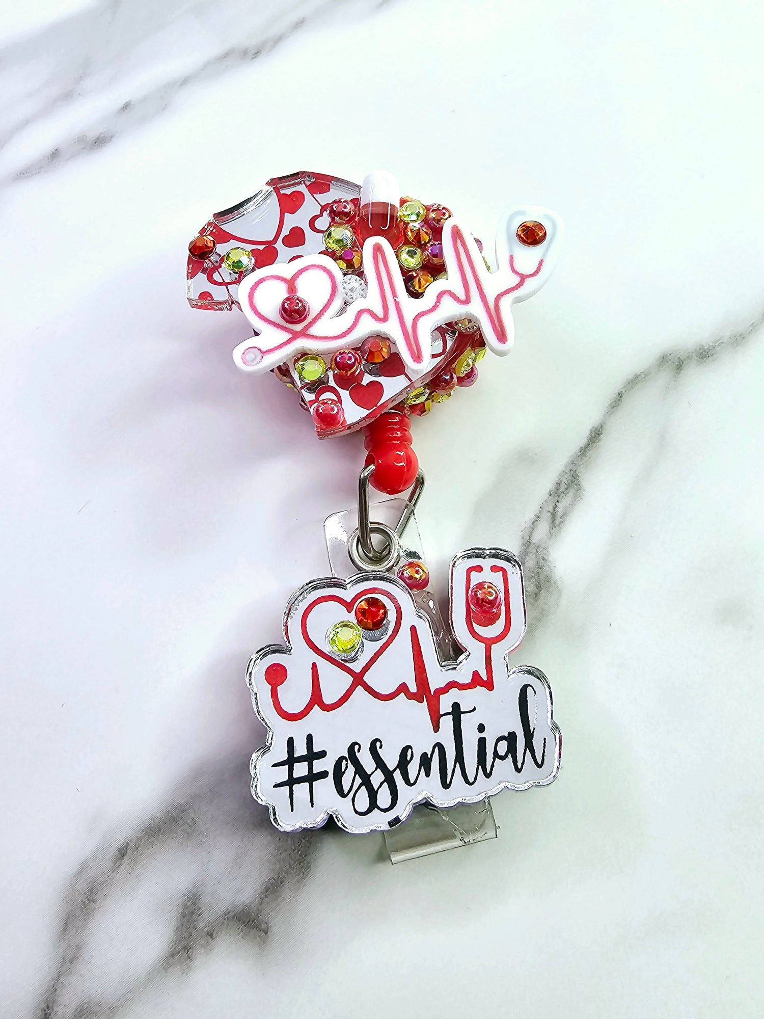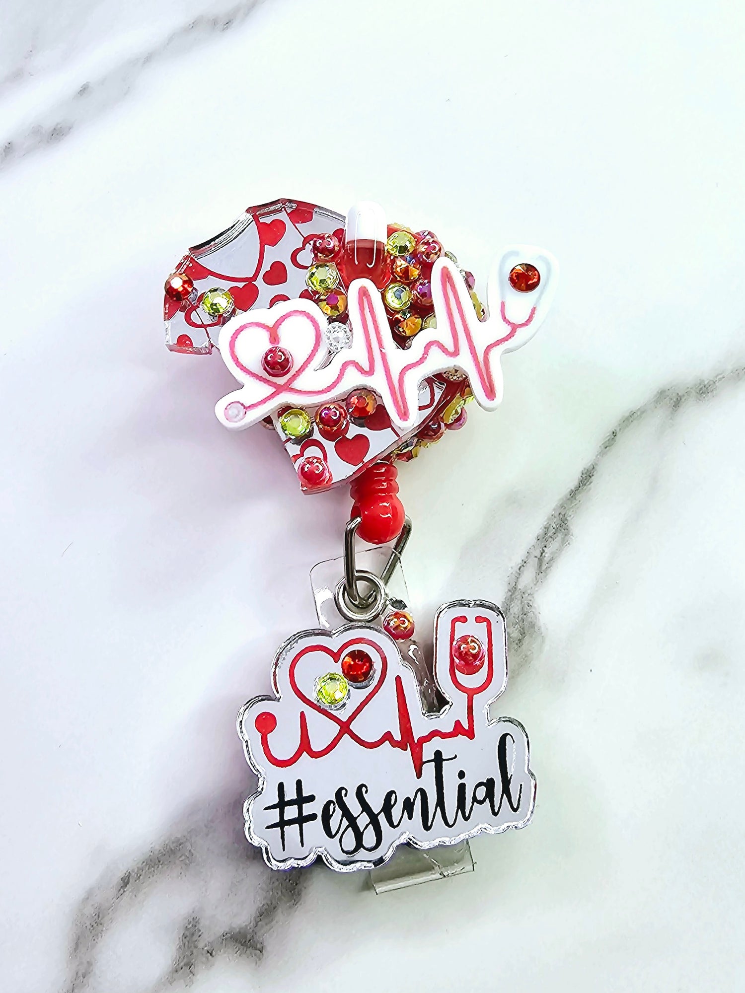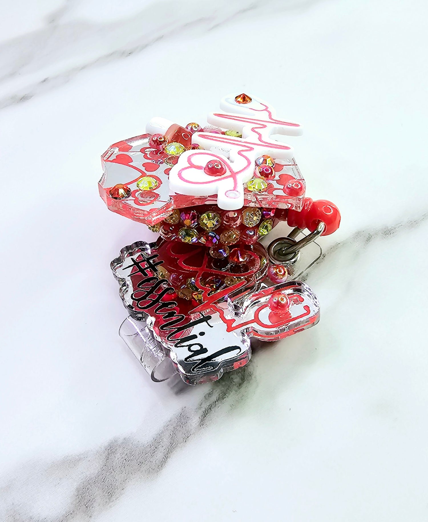 Silver mirror scrub top with red hearts, heart beat stethoscope and a fake pill with a silver mirror tail that has the same red heart beat engraved and "#Essential'!