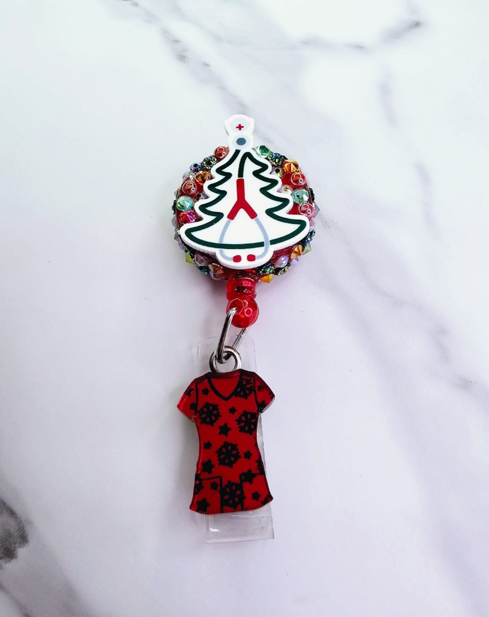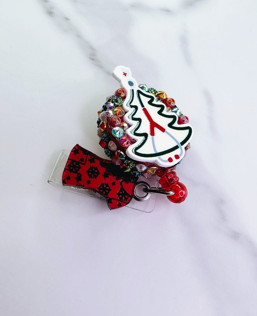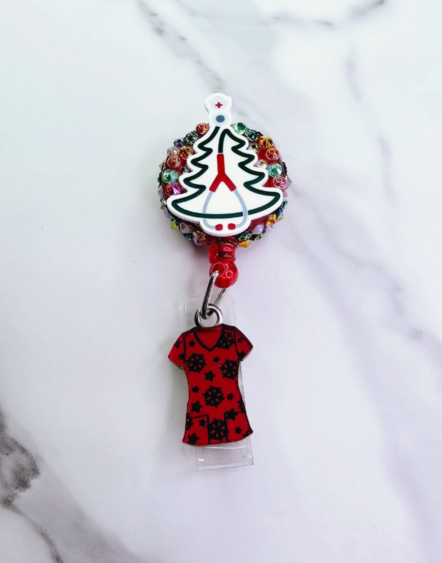 Stethoscope tree with a red mirrored snowflake scrub top.