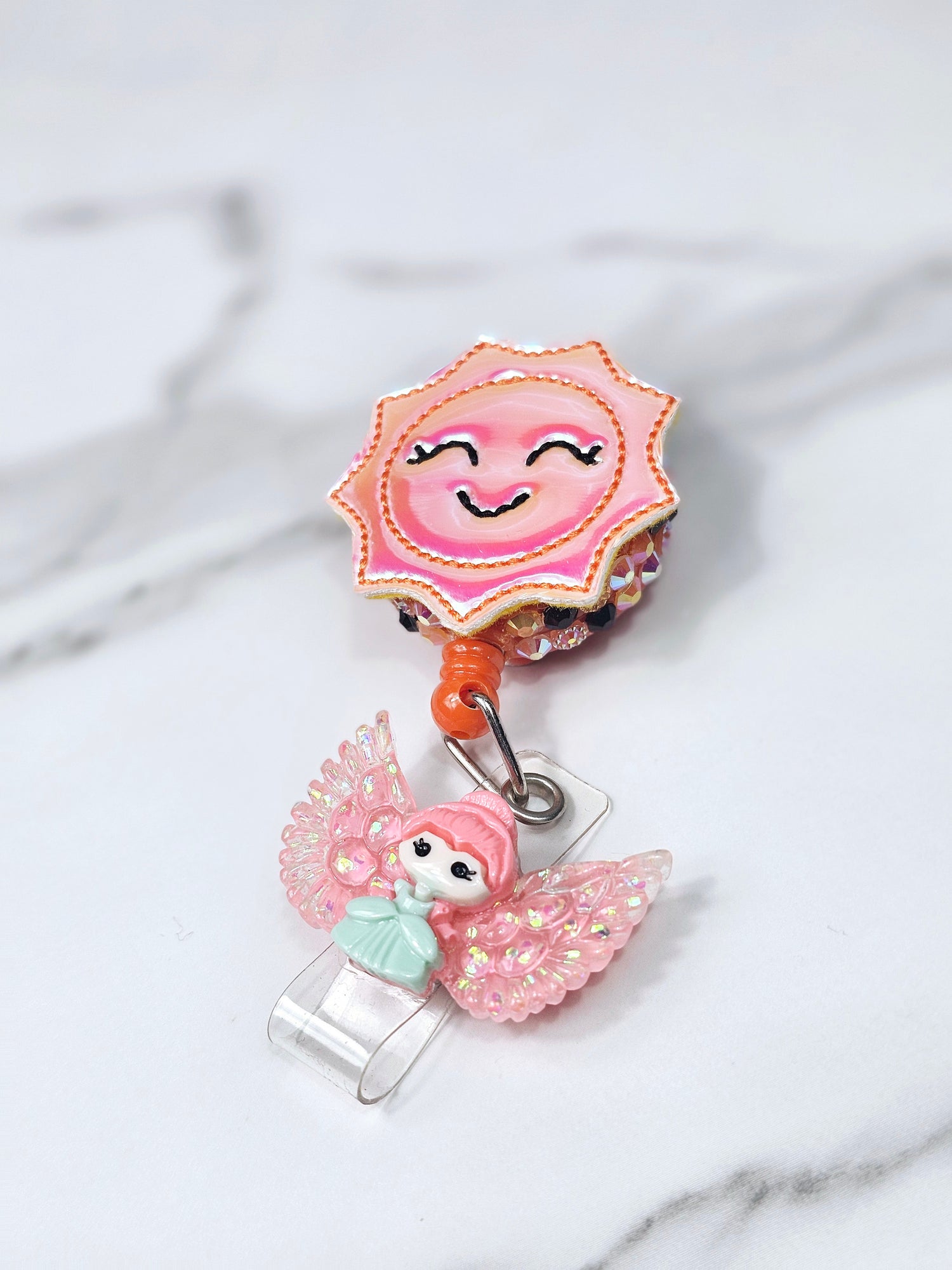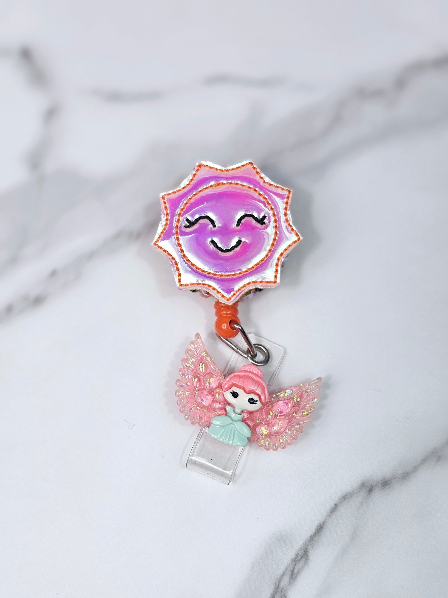 Orange/pink colorshift smiling sun with a fairy on the tail. Sun is made out of fabric