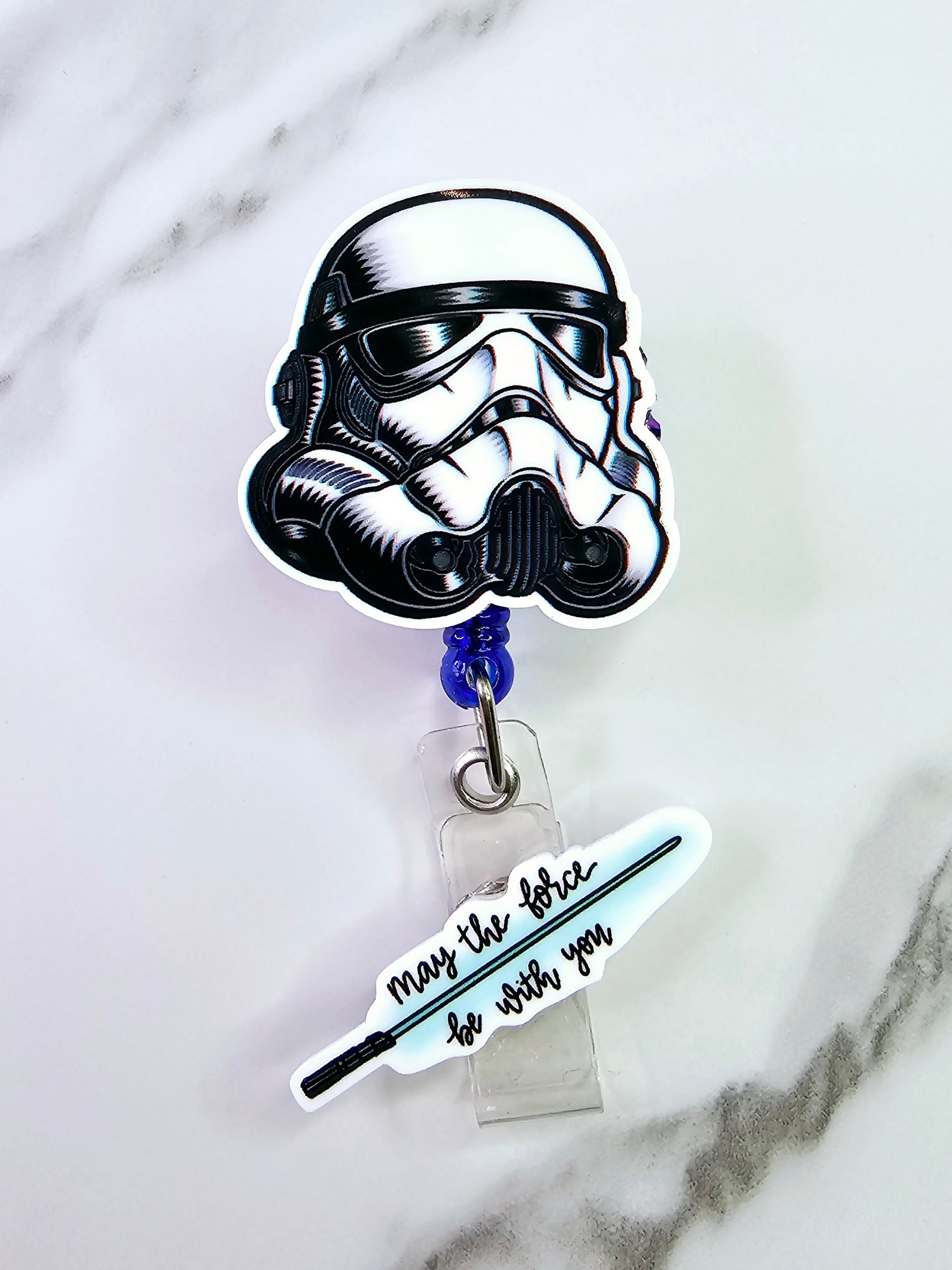 Storm trooper helmet with light saber quote on tail