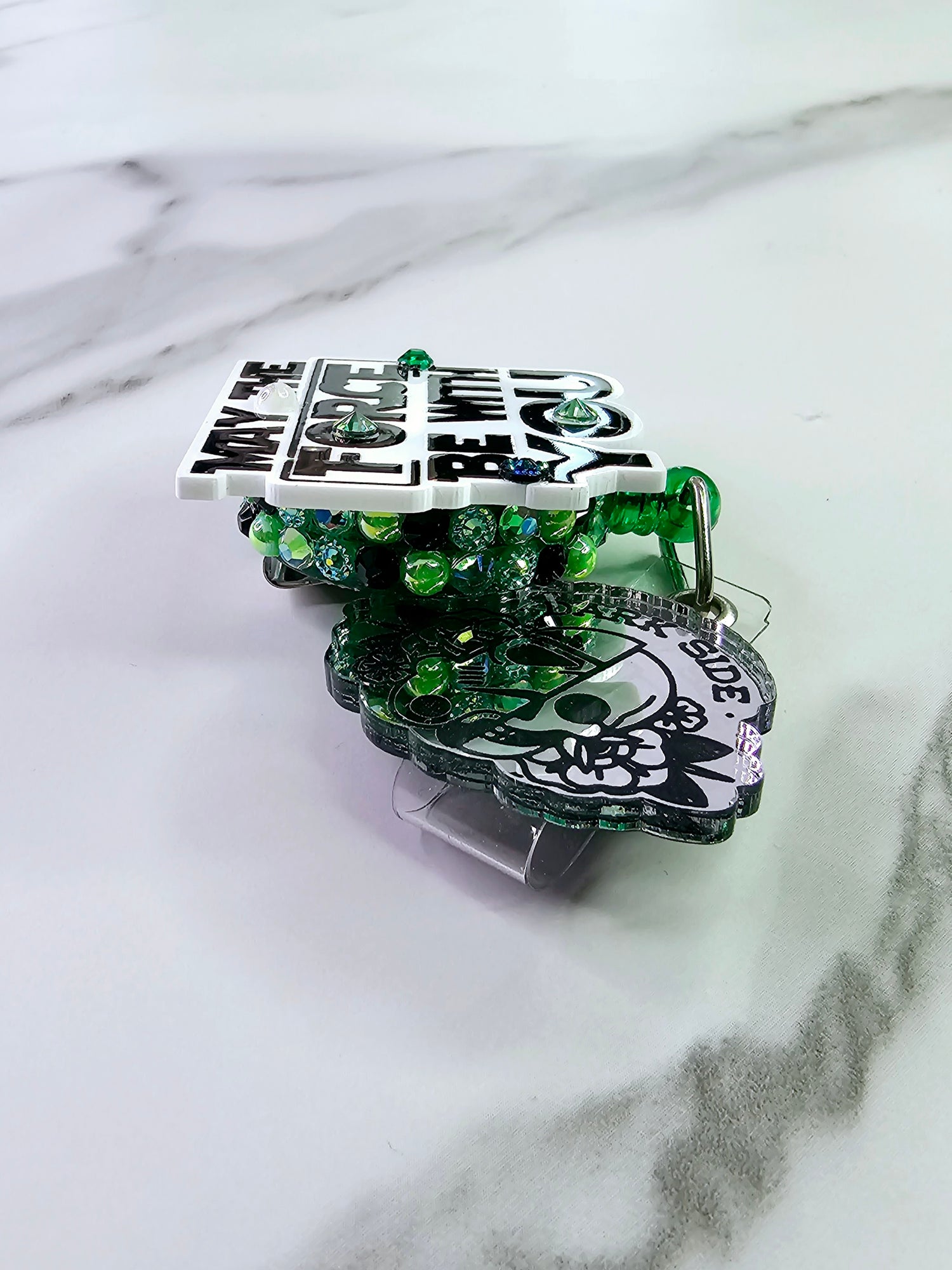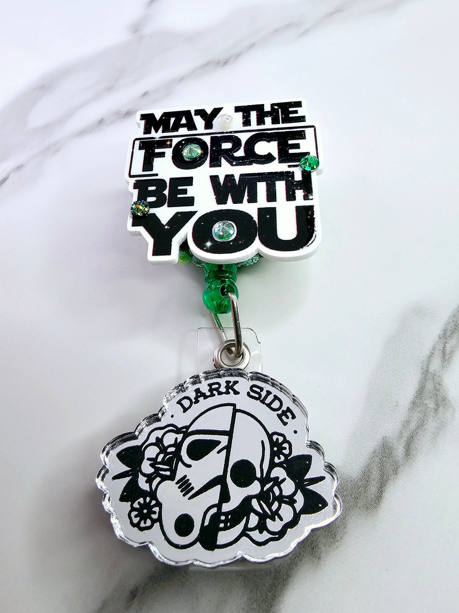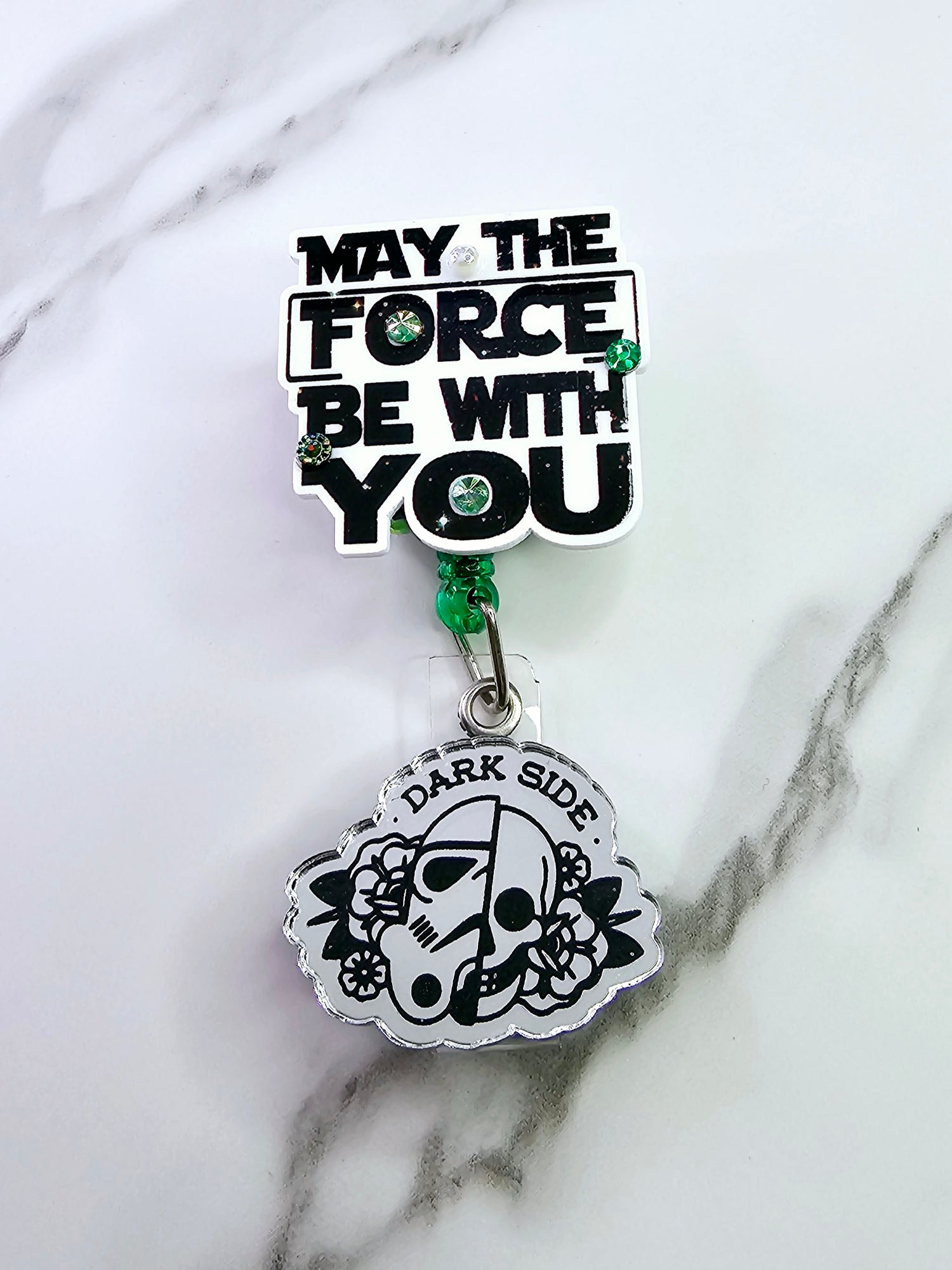 Galaxy printed quote with silver mirrored "dark side" floral 1/2 storm trooper/skull on tail