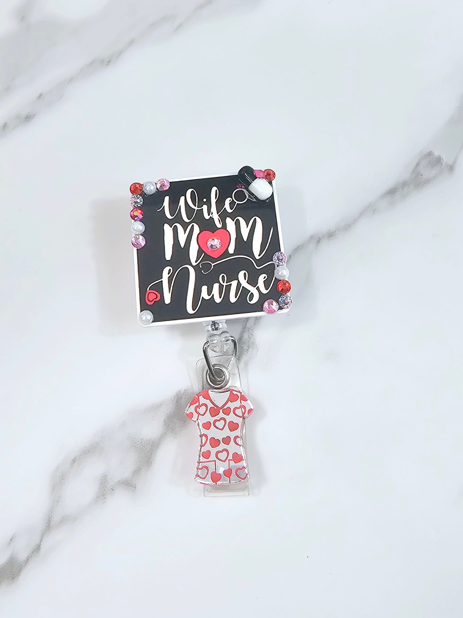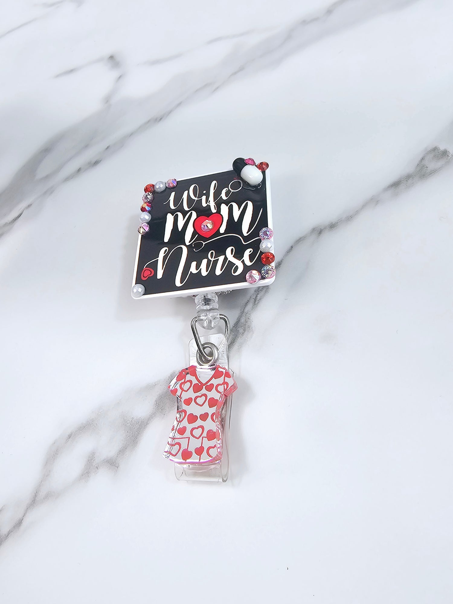"Wife Mom Nurse" with silver mirror acrylic scrub top with red hearts